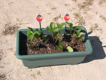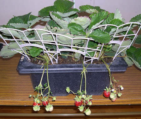 日が長くなり暖かくなってくると、次々に白い花を咲かせ実がつき始めます。5月くらいから収穫できるようになります。充分赤くなったら収穫してそのまま生で食べるか、ジャムやイチゴ酒にしたりして楽しんでください。 |