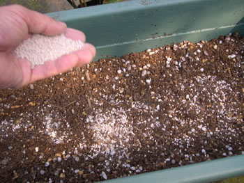 そこで1週間ほど前に有機石灰とグリーンドレシング肥料を一握りまいて耕し土となじませておきましょう。 |