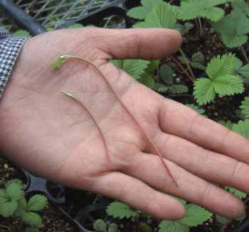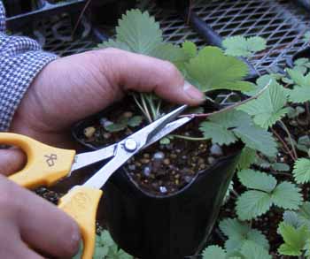 ランナー切り ランナーを切って、実つきを多く・大きくするか、 ランナーを伸ばして、株分け苗を殖やすかの判断をしてください。