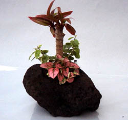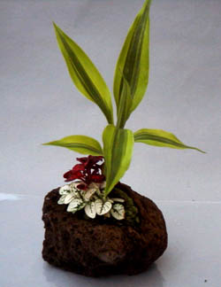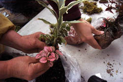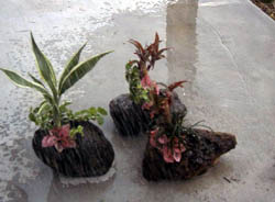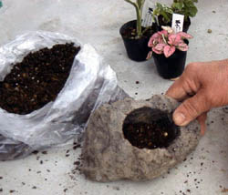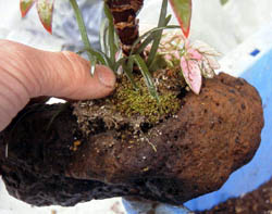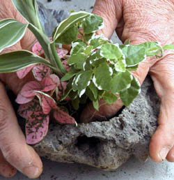 デザイン通り方向を決めて、手で寄せ植えを軽石の中に入れ、