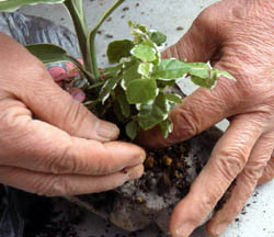 よせた植物が安定するまで、片方の手は離さないようにしましょう。 |