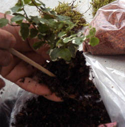 真中高く用土を入れると、苔をはった時に美しく見えます。 |