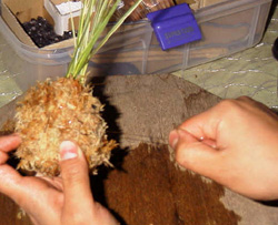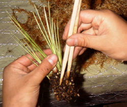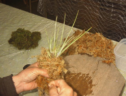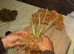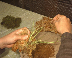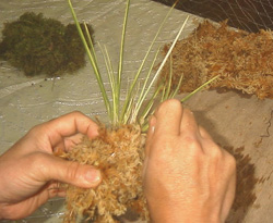 3)2つ目の帯状の水苔を手に持って巻き続けます。 |