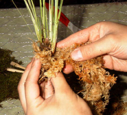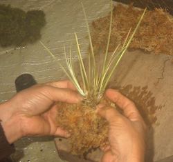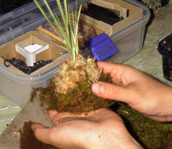 指の持つ場所は、水苔の下のほうを持って