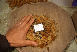 手のひらに、苔をうすく敷き詰めます。 |