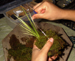 3)上の部部には、綺麗な苔を巻きつけていきます。