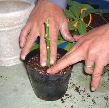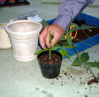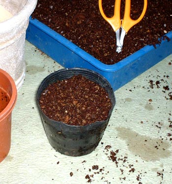 ビニールポットに、用土を詰めて、たっぷり水をやってから挿木です。