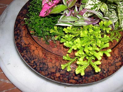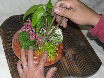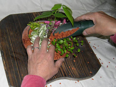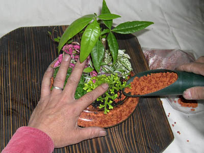 植物の外側から用土を詰めていきます。 |