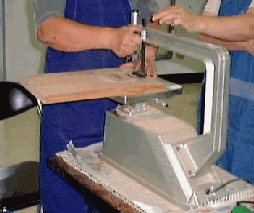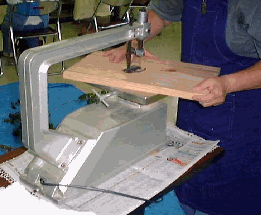 穴の中に、糸のこの刃を入れ、丸く穴(直径12cm)をける。