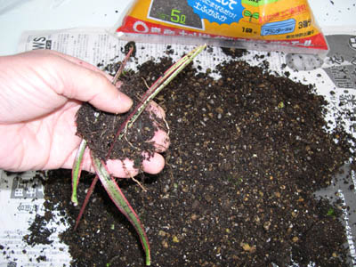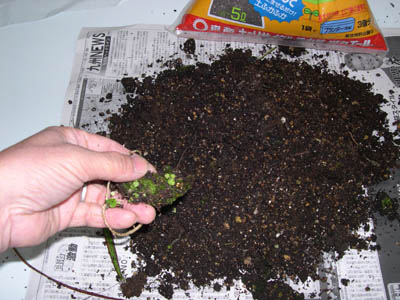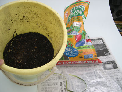 古くなった用土を乾きやすいように新聞紙に広げる。