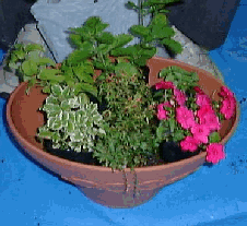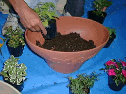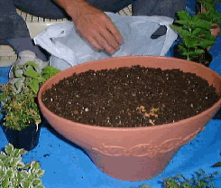 元の植木鉢の大きさが異なることが多いので、先に用土を入れ、デザインどうりに穴を掘りながら、植え替えていきます。 |