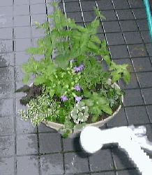 全部植えこんでしまったら、ウォータースペースやもとの鉢土の高さ・植物の配置、枝の伸び具合等を確かめて下さい。 |