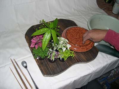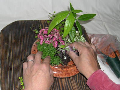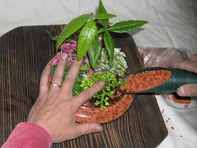 容器に土をある程度入れて容器の外側に土を寄せます。 デザインを時間をかけて考えます。 植物の性格や相性がよい品種を選びましょう。 |
