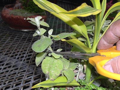 剪定は伸びすぎた植物の高さの半分〜3分の2部分を下の葉の上で切ります。 この写真の、ハサミの先端の位置から切ります。 |