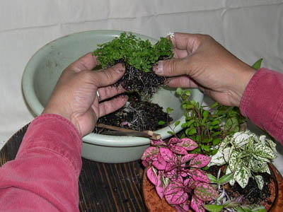 植物をポットのまま手でほぐし優しく抜きます、根土を箸などを使って少しほぐし落としましょう。 |