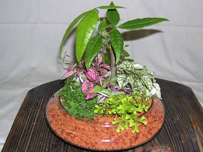 出来上がりの寄せ植え見本はこちら 1・前準備として、穴なし容器や、ガラス容器とプチ観葉・みに観葉植物と土・器具を用意します。 土は、名田植物園のオリジナル混合です。 |
