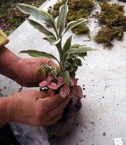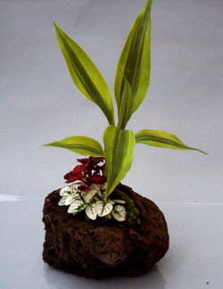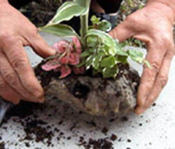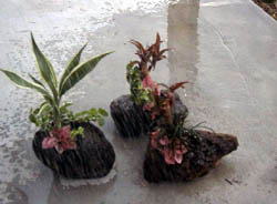 デザイン通り方向を決め組み合わせて軽石の中に入れ土を入れて軽く鎮圧します。 |
