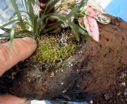 土が見える隙間に合わせて苔を小さく割り少しづつ張ります。 苔のうえから指で強く押さえて活着を促します。 |