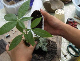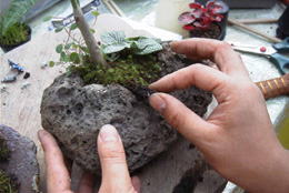 植物の根をいためないように気をつけ相性・生育環境が同じのものを選んでデザインを考える。 |