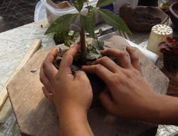 | 水かけ(腰水法) | 軽石が白く乾いてきたら作品の半分の水位の中に「ザブン」としばらくつけて水を与えます。 |