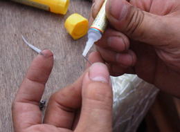 足付け方法1 虫ピンにゼリー状の瞬間接着剤をつけてフィギュアに直接押しつける。 <裏技> 虫ピンが長いものは適所でカットする。 |