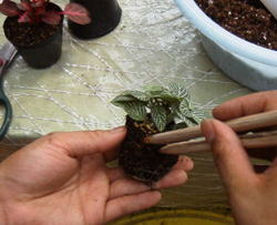 苗を手に取りビニールポットの周りからほぐすと土が取りやすい。 又は、お箸などを使って土を落としましょう。 |