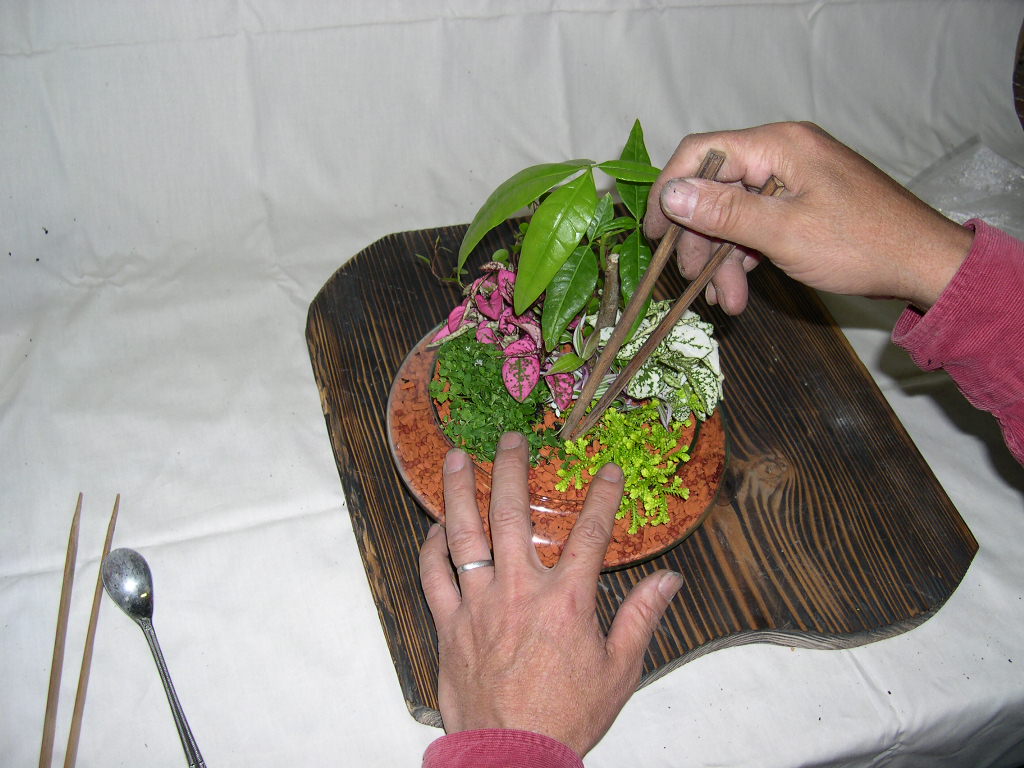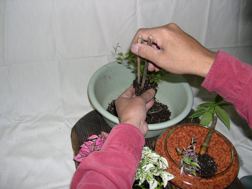 | セラミス用土を植物の周りや株の隙間に入れて竹箸で根の隙間に誘導します。 |