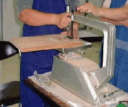 穴の中に糸のこの刃を入れ直径12cmの穴をあける。 切り取った端材で小物を作ります。 |