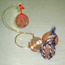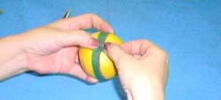 次は4段目をさしている所です。 段に等間隔に見えるように、クローブの大きさをそろえたり、頭が取れないように気をつけてさしていく。 次ぎの段を5個次ぎの段を5個くらいさしていきます。 |