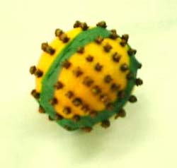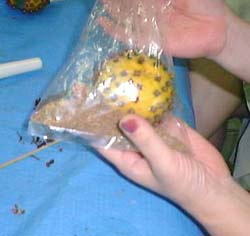 ポマンダーの手入れ 毎週一回、とくに雨降り前にポマンダー全体をやさしく押さえて果汁を少し出しながらスパイスの粉をまぶします。 <裏技> あわてて果汁を出しすぎると半分に割れたます。 スパイスの粉をまぶすのを忘れたりすると、カビが生えます、良く乾かしてください。 |