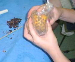 果実を袋の入れて果汁を出しスパイスを塗している所。 |