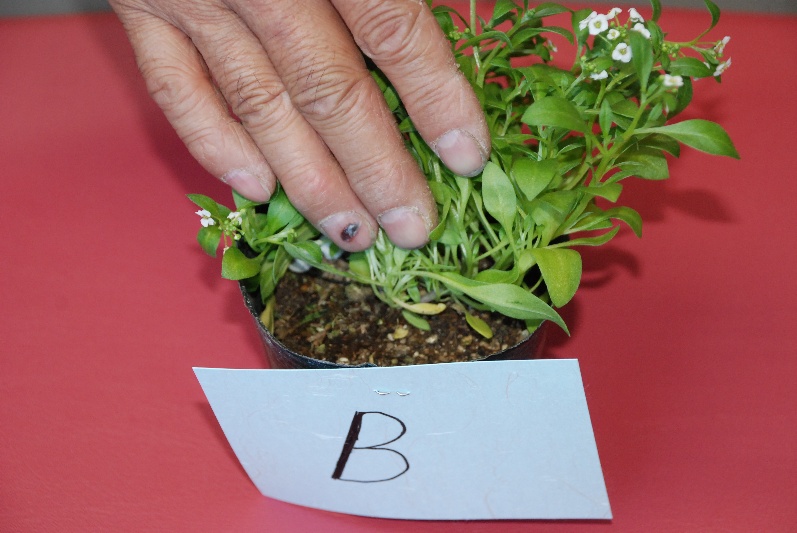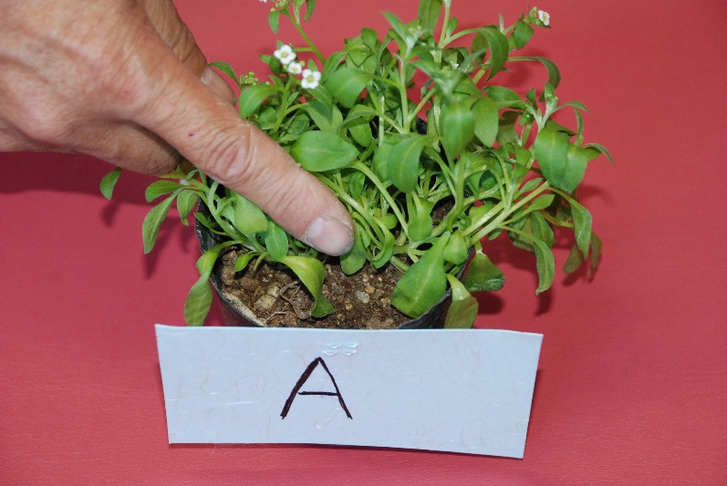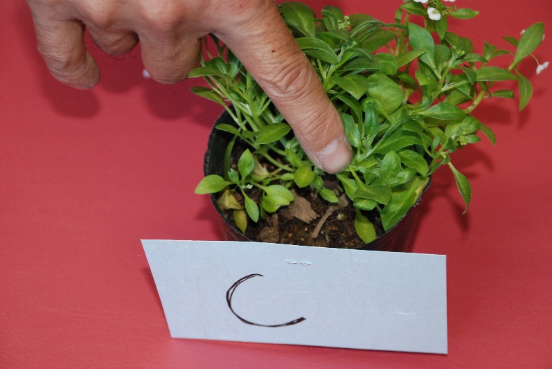 Aは、土が乾きすぎで遅いタイミングです。 Bは、土が白っぽく乾き初め水かけのベストタイミングです。 Cは、土が湿っているのでもう少ししてから与えます。 |