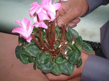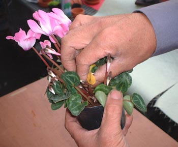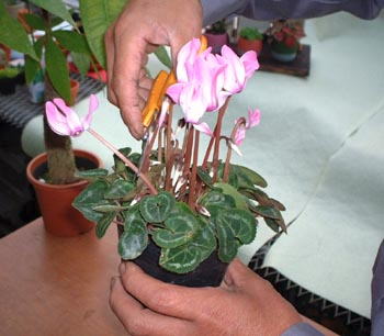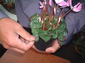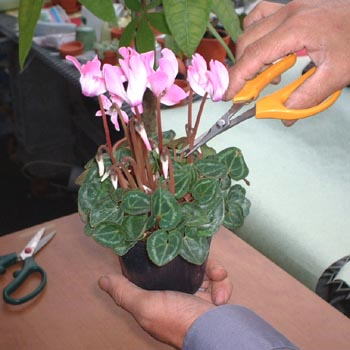 ここでは悪い例 決してこんな風に、はさみで切らないで下さい。 シクラメンの場合は、球根腐敗病という病気が一番怖いので切ってはいけません。 |