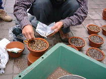 直径15cm平鉢に、鉢底ネットを入れ鉢底石少し厚めの3cm入れ平らにします。 種蒔き専用土を鉢上部擦り切れにし軽くトントンとたたき平らにます。 <裏技> トントンをしすぎると大きめのゴロ土が上に上がってきて種まきがしにくくなります。 |