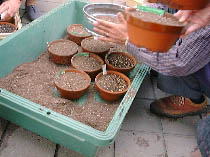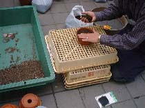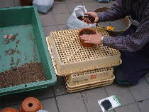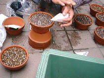 土が平らになったら、両方向からやさしい水をぼた落ちしないよう何回かに分けてかけます。 <裏技> 水がボタ落ちして穴が空くようだったら霧吹きで気長に散布してください。 水分が落ち着いたらバーミキュライトを2mmの厚さに覆ぶせます。 <裏技> フルイ目の大きさは3〜4mm目がお勧めです。 |