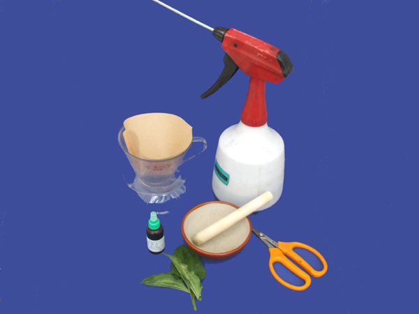 準備する物 ・すり鉢と摺り子木棒 ・コーヒーメーカーと濾紙 ・はさみ ・アルコール消毒剤 ・ハンドスプレー(霧吹き器) ・オオバコの葉3枚 オオバコはこちらで見る ・植物活性剤 お勧めは、ビタナールとBG-2000の組み合わせ 他にハイアトニックやHB-101 |
