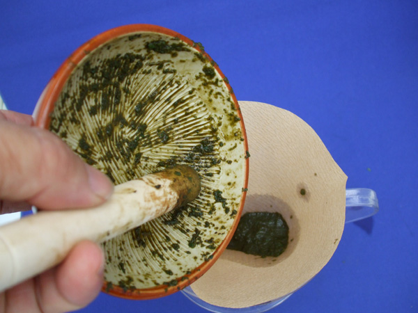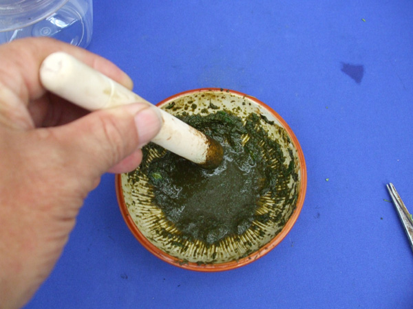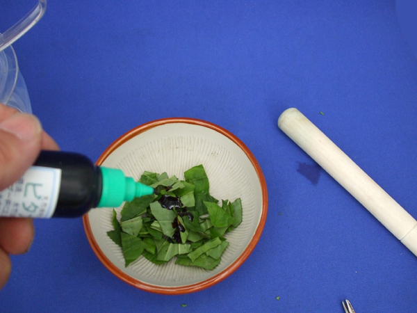 原液の手順 すり鉢にオオバコの葉をはさみで1cm位に細かく切ります。 |