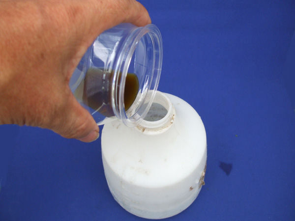 濾紙を破らない程度に濾紙に残った水分も絞りましょう。 起死回生剤の原液の出来上がりです。 <裏技> ここで絞るのはオオバコや復活してほしい植物のエキスを取るための大事な作業です。 |