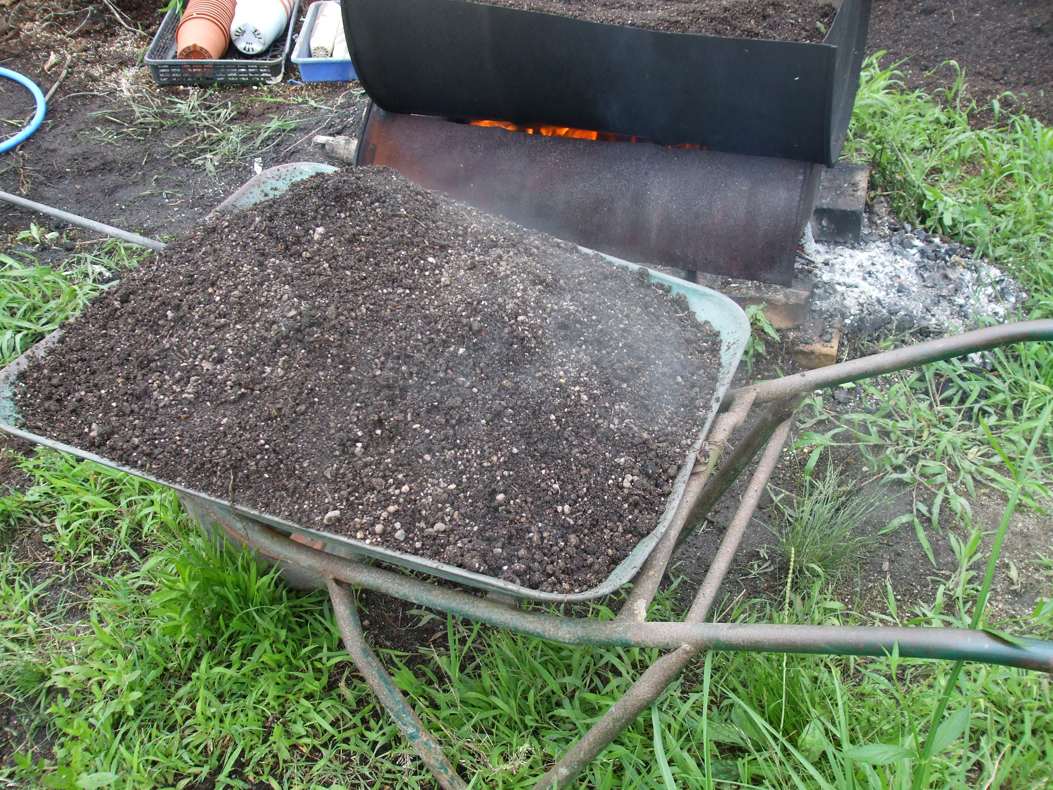3回目の蒸気が上がったら運搬車に乗せて屋内で保管する。 焼き土の完成です。 |