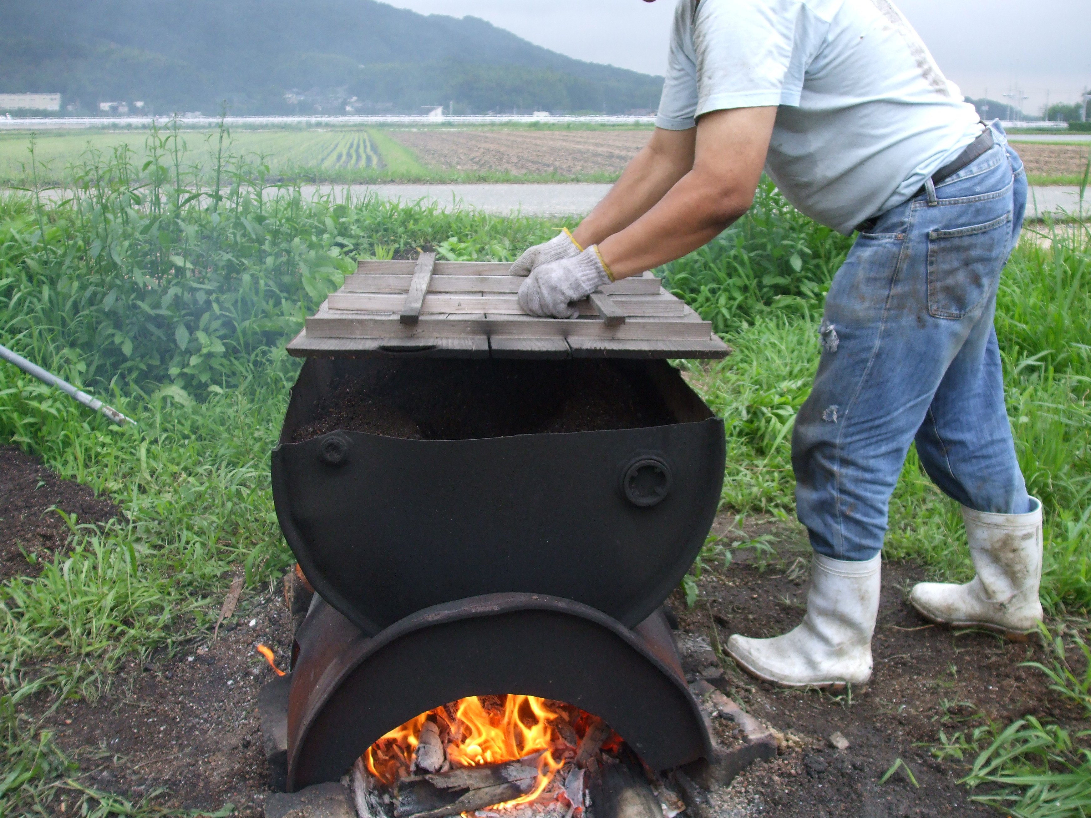 フルイにかけた土をドラム缶半分の中にいれ少し水分を与え板でフタをする。 |