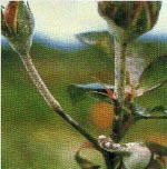 春から初夏にかけて発生する、ナシ・リンゴ・ボケの主要病害です。葉裏に毛羽だった丸い病斑ができます。薬剤を散布して予防してください。 |