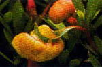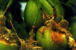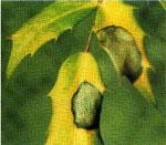 葉がもちを焼いたように膨れ、やがて黒褐色となり腐敗します。被害葉は早めに摘み取り、薬剤散布して予防して下さい。 |