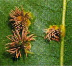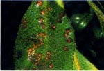 葉に小さないぼ状の病斑ができ、やがて薄皮が破れ中からさびに似た粉(胞子)が飛びます。たくさんの種類があり、発生時期も異なります。通気性をよくし薬剤散布して予防して下さい。 |