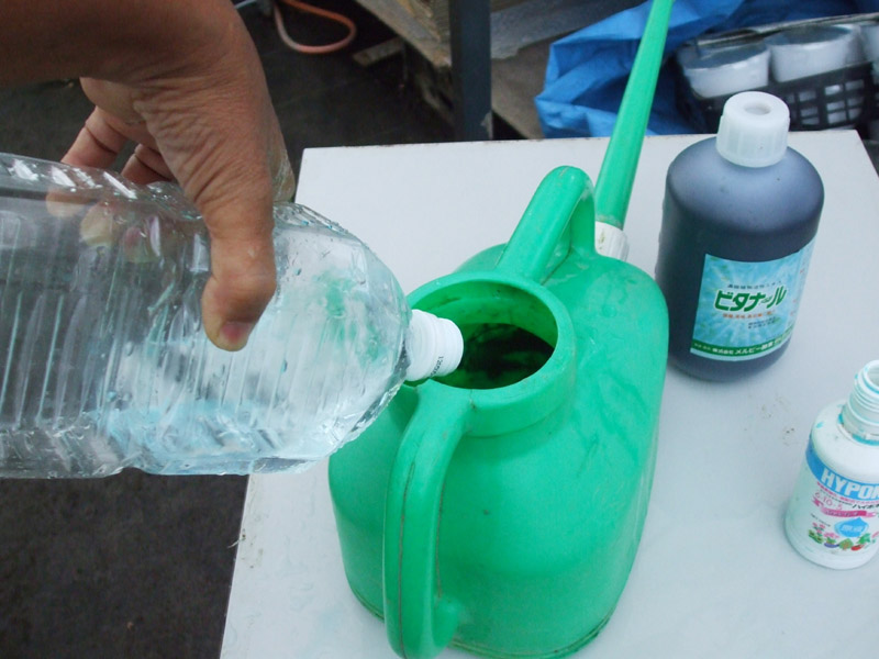 ジョロを持って数方向から散水します。 <裏技> 一方方向からの散水では手前方向の隅が掛かっていないことが多いので四方向から散水する。 |