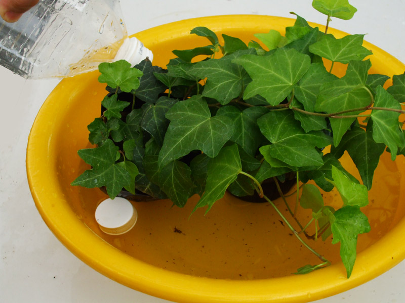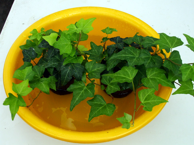 | 普通の乾燥具合だったら約10〜20分浸ければ水やりが出来ます。 左の乾きすぎたアイビーは60分浸けていました。 60分後には萎れていた葉も立ち上がってきました、良かったですね。 |