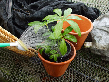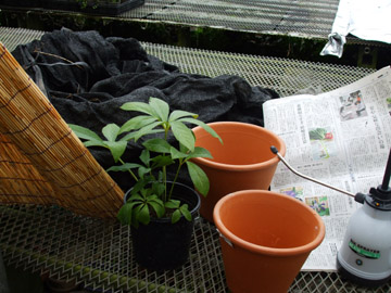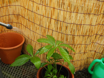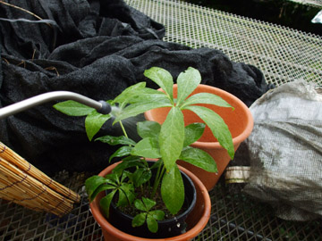 | 日除けの他に体温を下げる方法は、葉水と言って葉に湿る程度の水分を持たせ気化熱利用で植物体温を下げる効果がある。 30度以上の日に夏の期間定期散布する。 ・13:30分に1回だけ。 ・11:30と14:00の2回散布。 ・11:00と13:00時と15:00の3回散布。 ・定時に機械を利用して散布。 |
