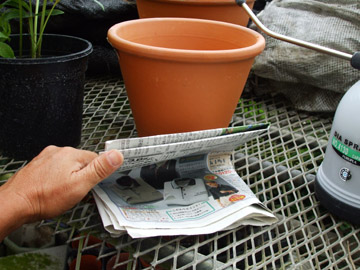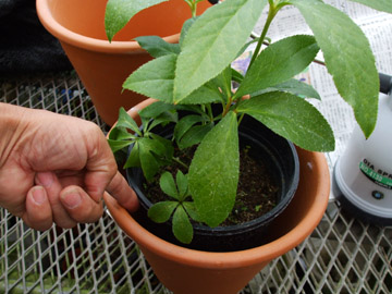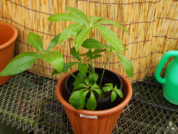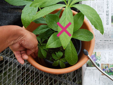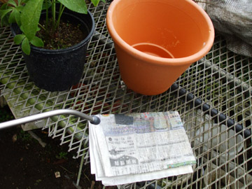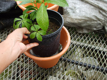 | 簡単で誰でも出来る方法で二重鉢があります。 鉢と鉢の隙間は3cm位が理想で鉢の間に指1本ずつ入り外鉢は素焼きの鉢がお薦めです。 <裏技> 鉢底に雑巾や新聞紙1枚を折って引くと効果が倍増し、外鉢の下には煉瓦などで下駄を履かせると良いでしょう。 |