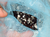 | 袋の中に種が貯まったらすぐに袋の中に 同量のパーライトかビーナスライト入れて 袋のまま5号鉢〜6号鉢の土の中に埋めて 夏の高温に合わせます。 30度以上の温度に30〜40日合わせるのが高温処理です。 |